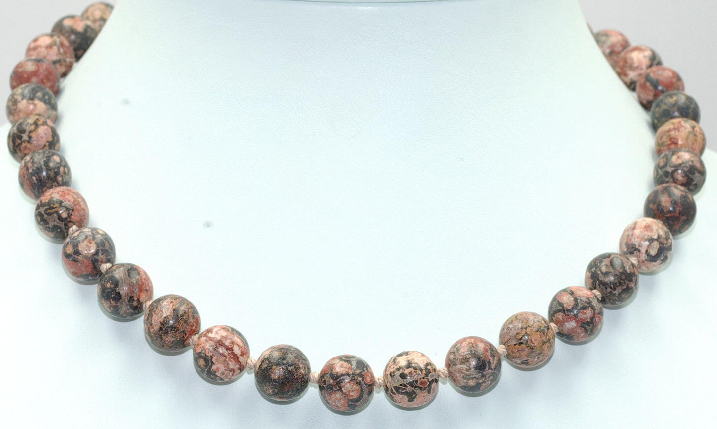 Diese Leoparden-Jaspis Kette zeigt warme Erdtöne und markante Muster, die jeder Perle ihren eigenen Charakter verleihen.