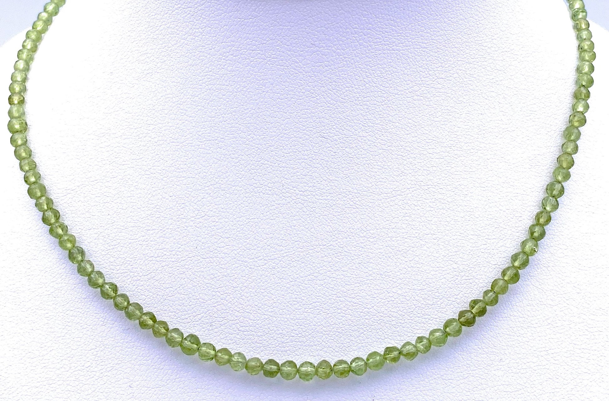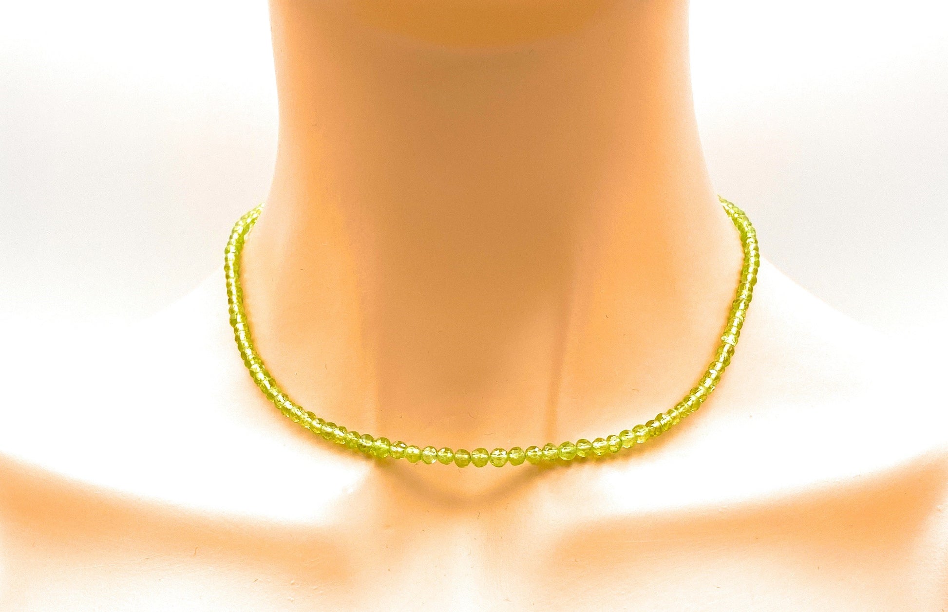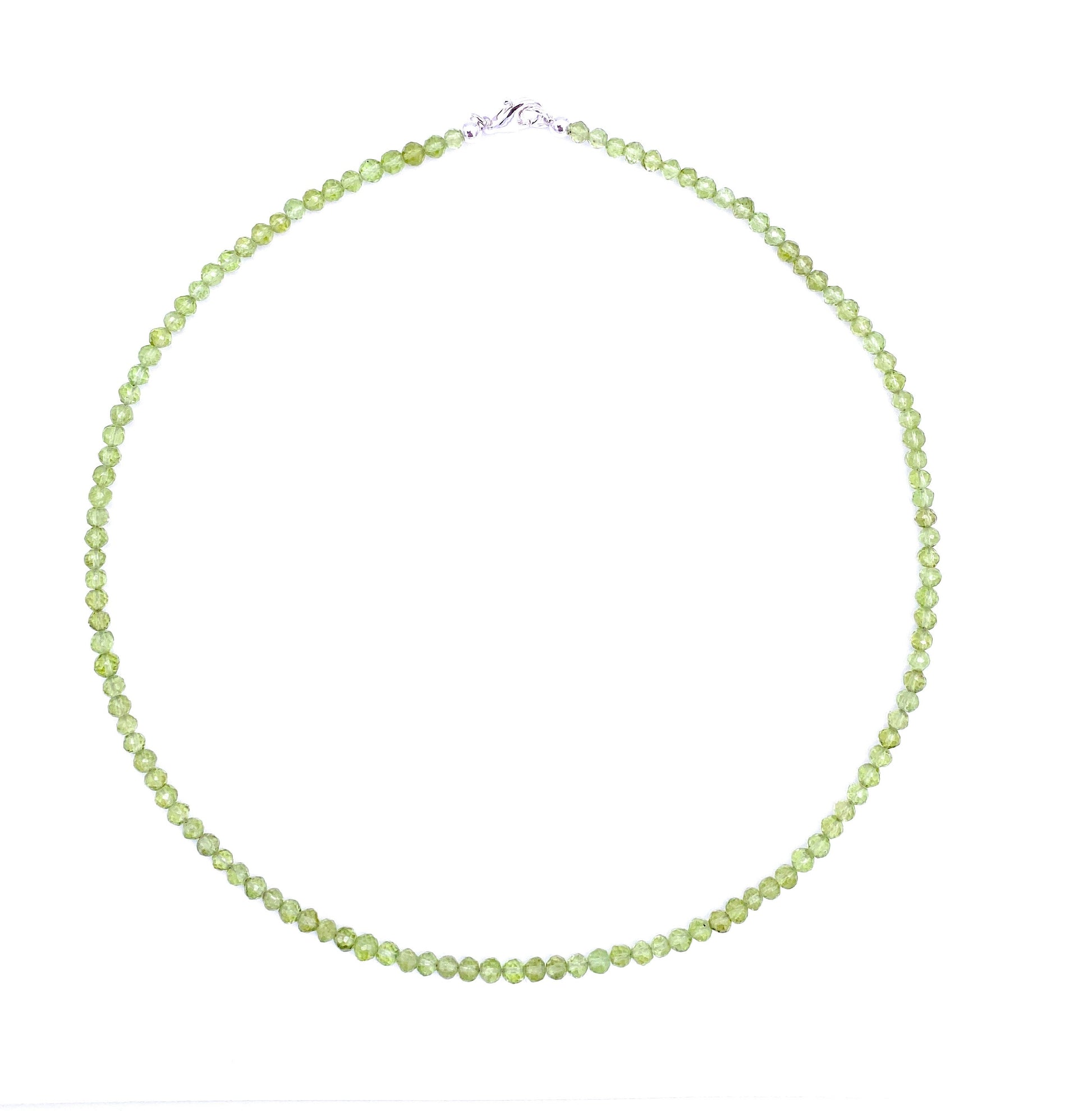 Die Peridot Kugeln sind facettiert und ca. 4 mm groß. Die Kette Peridot ist auf Edelstahl aufgezogen. Die Länge der facettierten Peridot Kette ist ca. 45 cm. Der Verschluss ist ein Karabiner aus 925er Sterling-Silber.