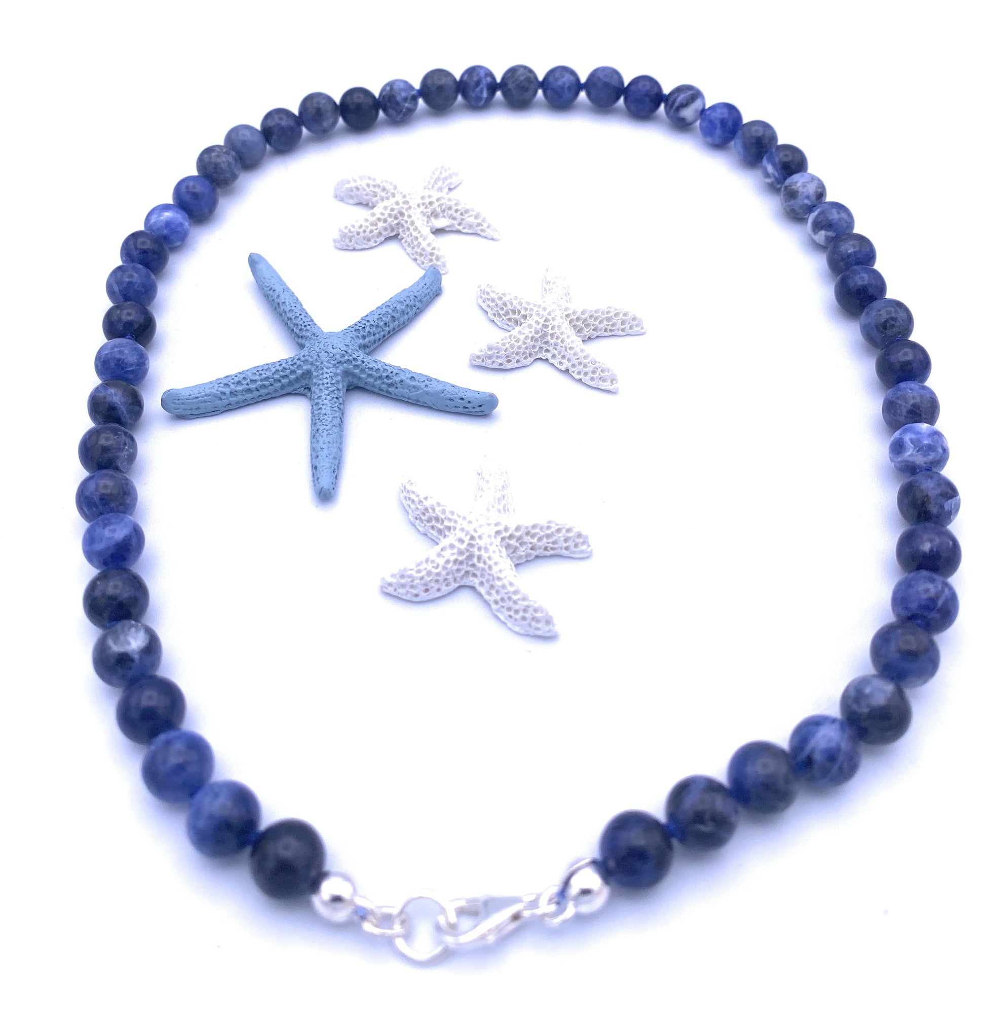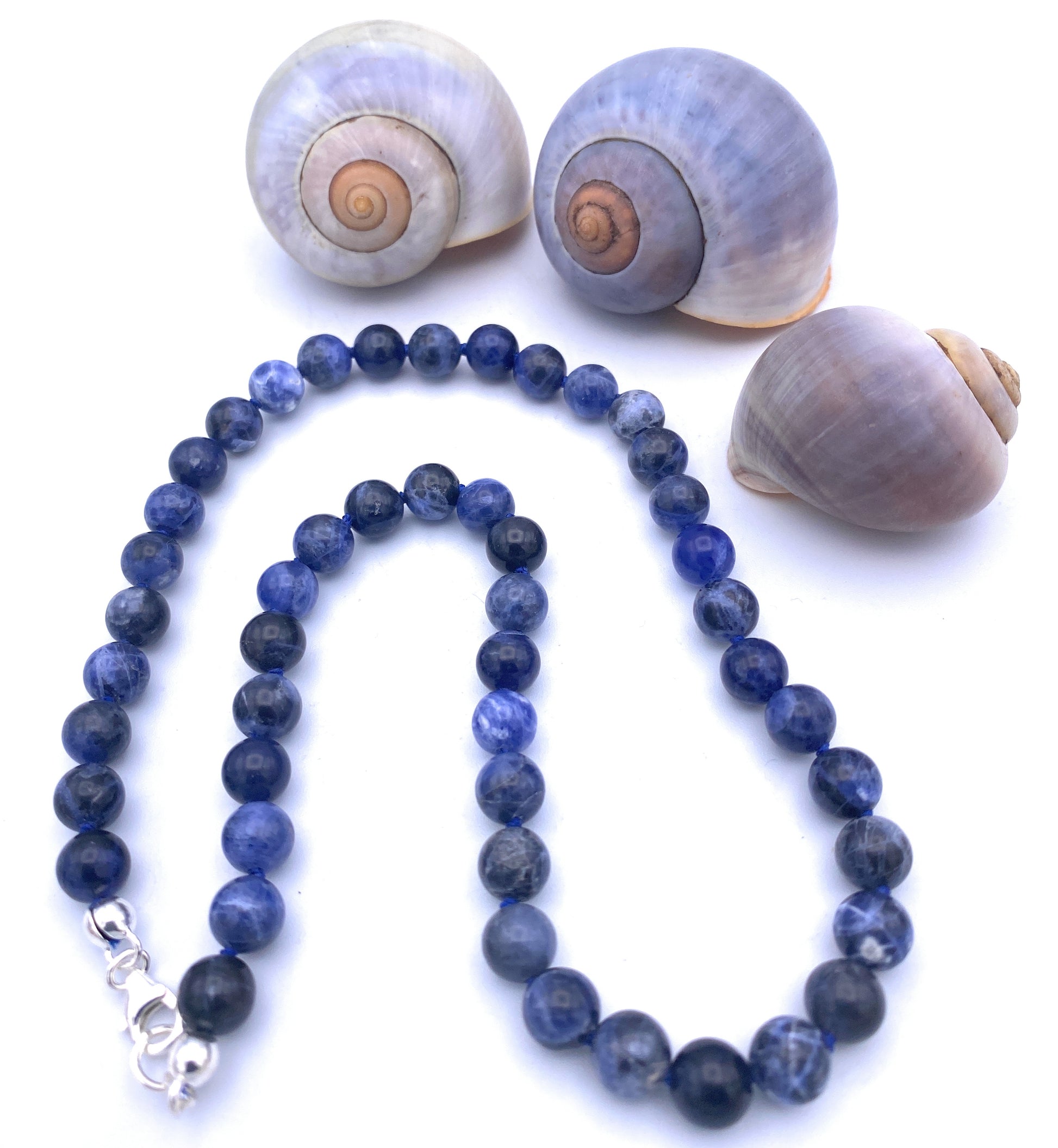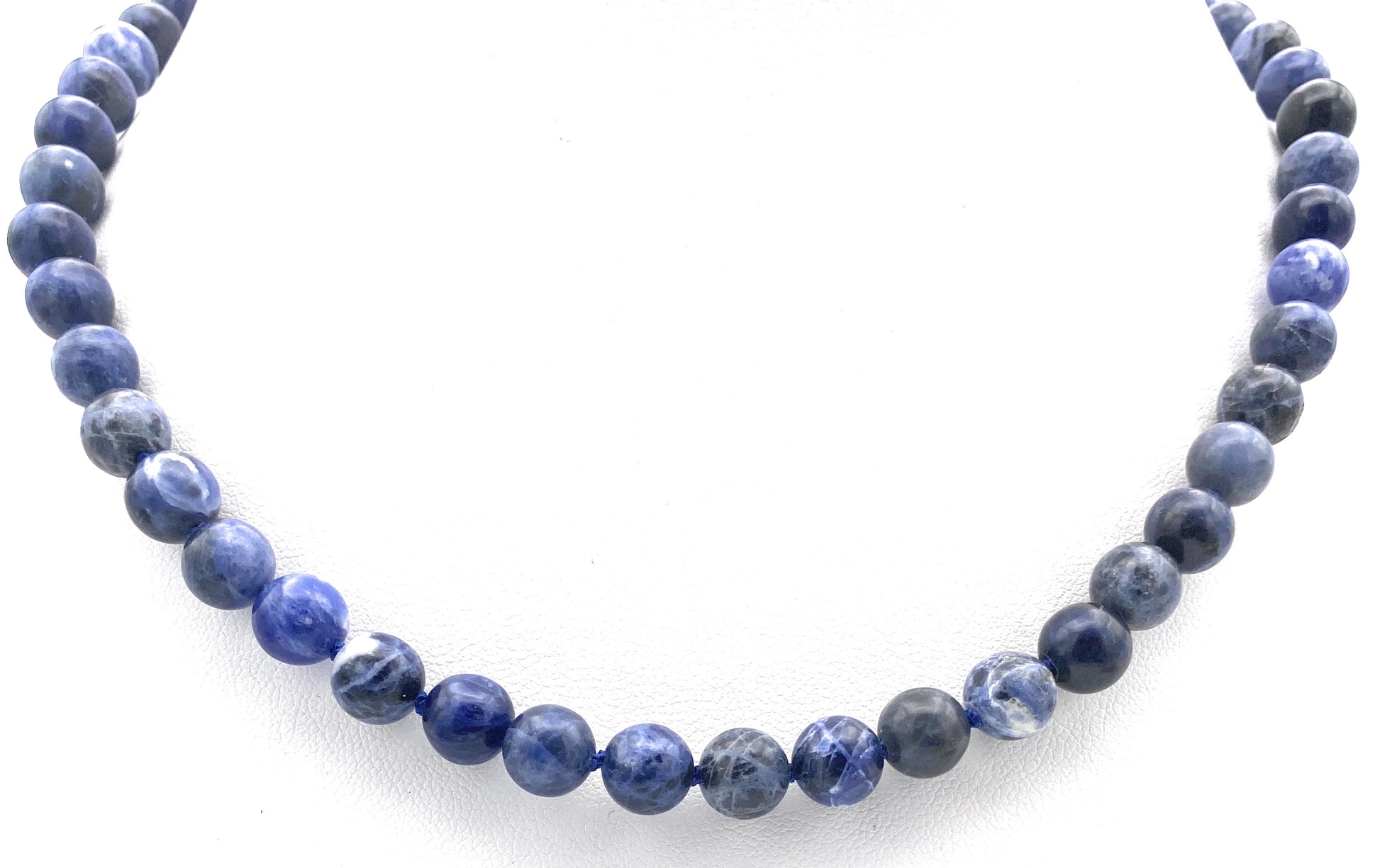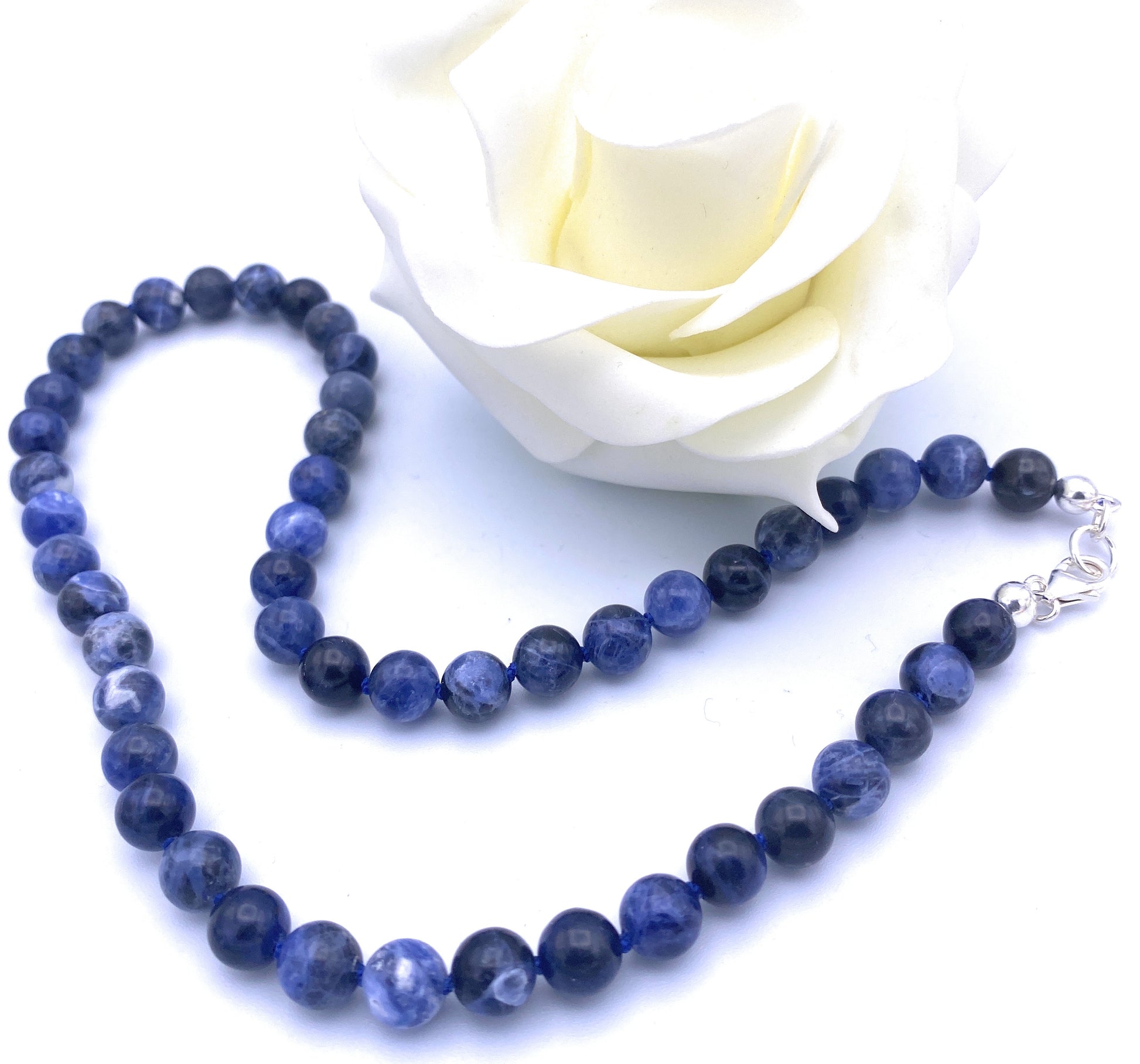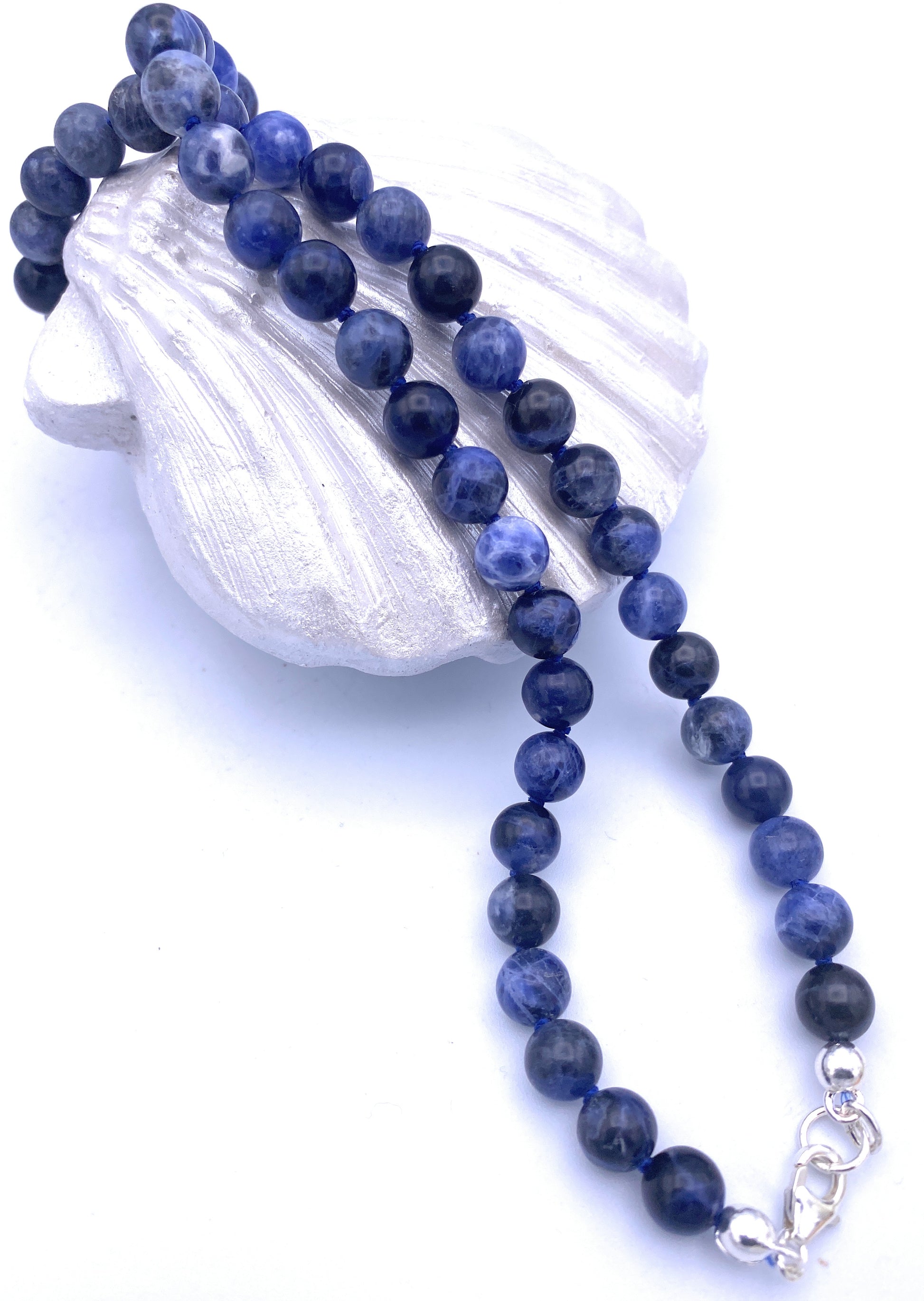 Der Sodalith ist blau, mit seiner typischen hellen Marmorierung. Die Sodalith Kugeln sind ca. 8 mm groß. Jede Sodalith Kugel ist einzeln mit Perlseide geknotet. Die Länge der Sodalith Kette ist ca. 45 cm. Der Kettenverschluss zählt zu den wichtigsten Bestandteilen bei der Schmuckfertigung. Der Verschluss ist ein stabiler Karabiner. Alle Verschlussbestandteile sind aus 925er Sterling-Silber.
