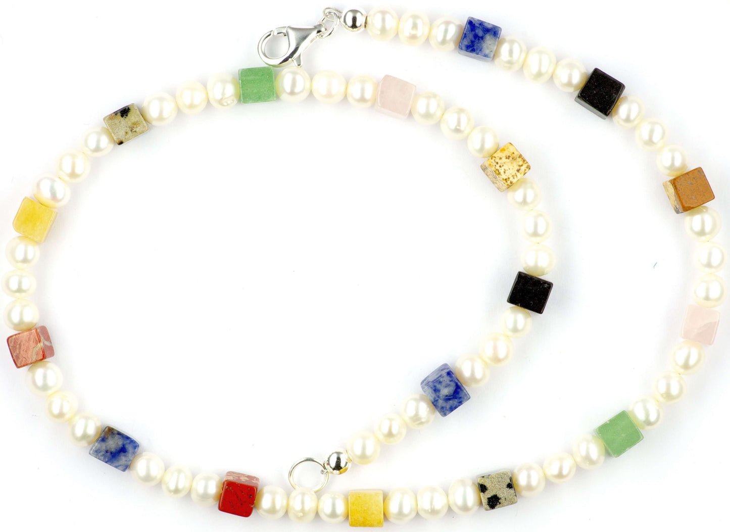 Diese feine Perlenkette verbindet klassische Eleganz mit verspielter Farbfreude: zarte weiße Süßwasserperlen wechseln sich rhythmisch mit kleinen, farbenfrohen Edelsteinwürfeln ab.